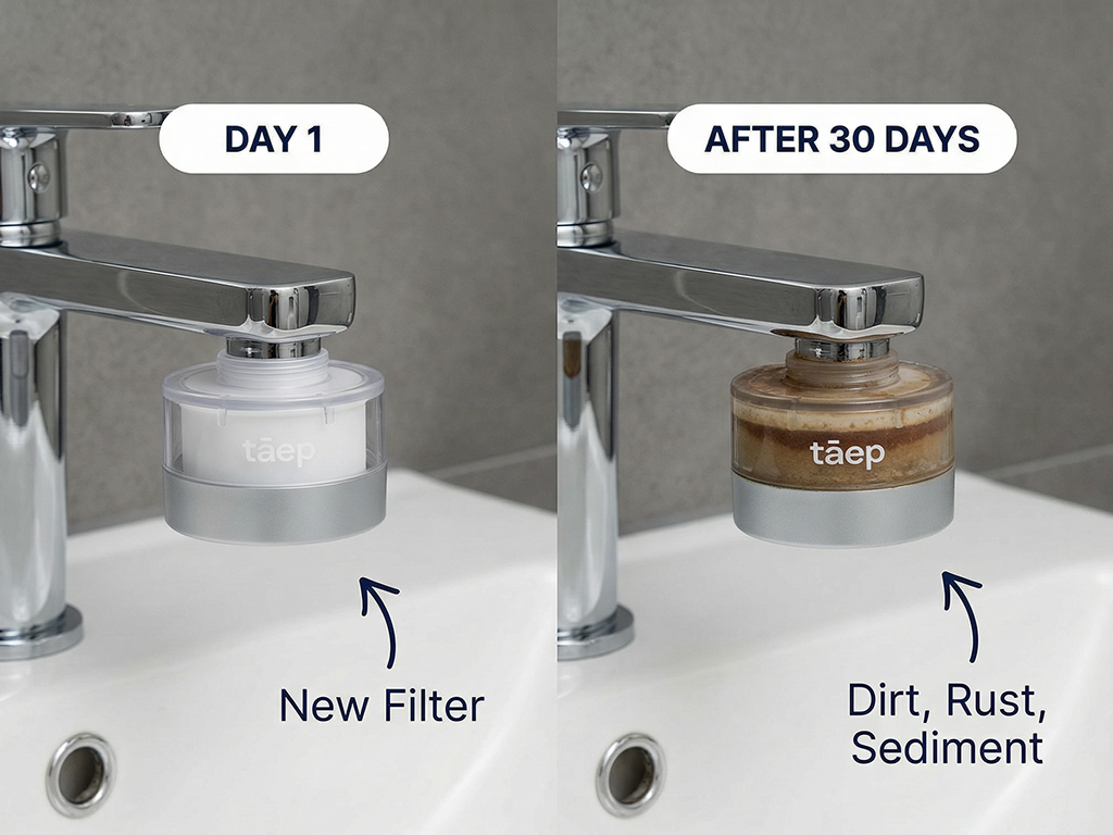 tāep reduces chlorine, limescale, heavy metals (like lead and copper), and microplastics — all of which can irritate sensitive skin and damage the natural moisture barrier. Our dual-layer filter targets both physical and chemical impurities.